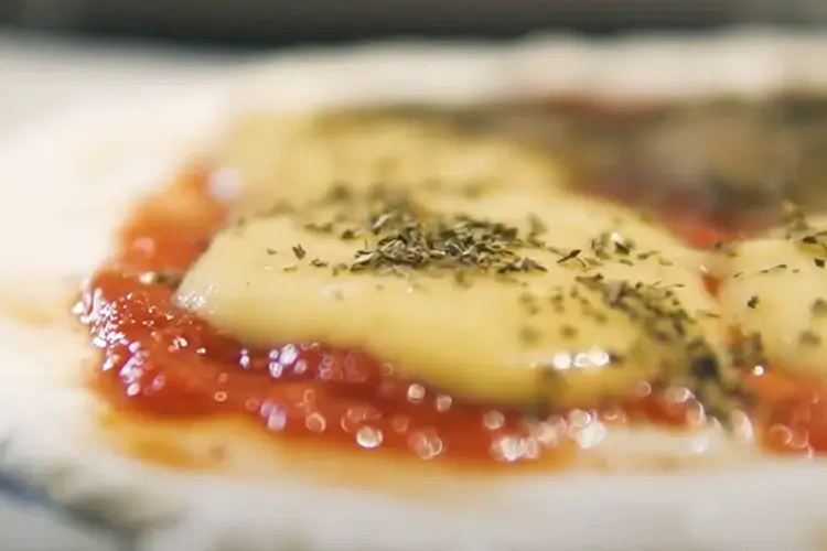 • トマトソースをしき、できたての餅チーズをトッピングします。