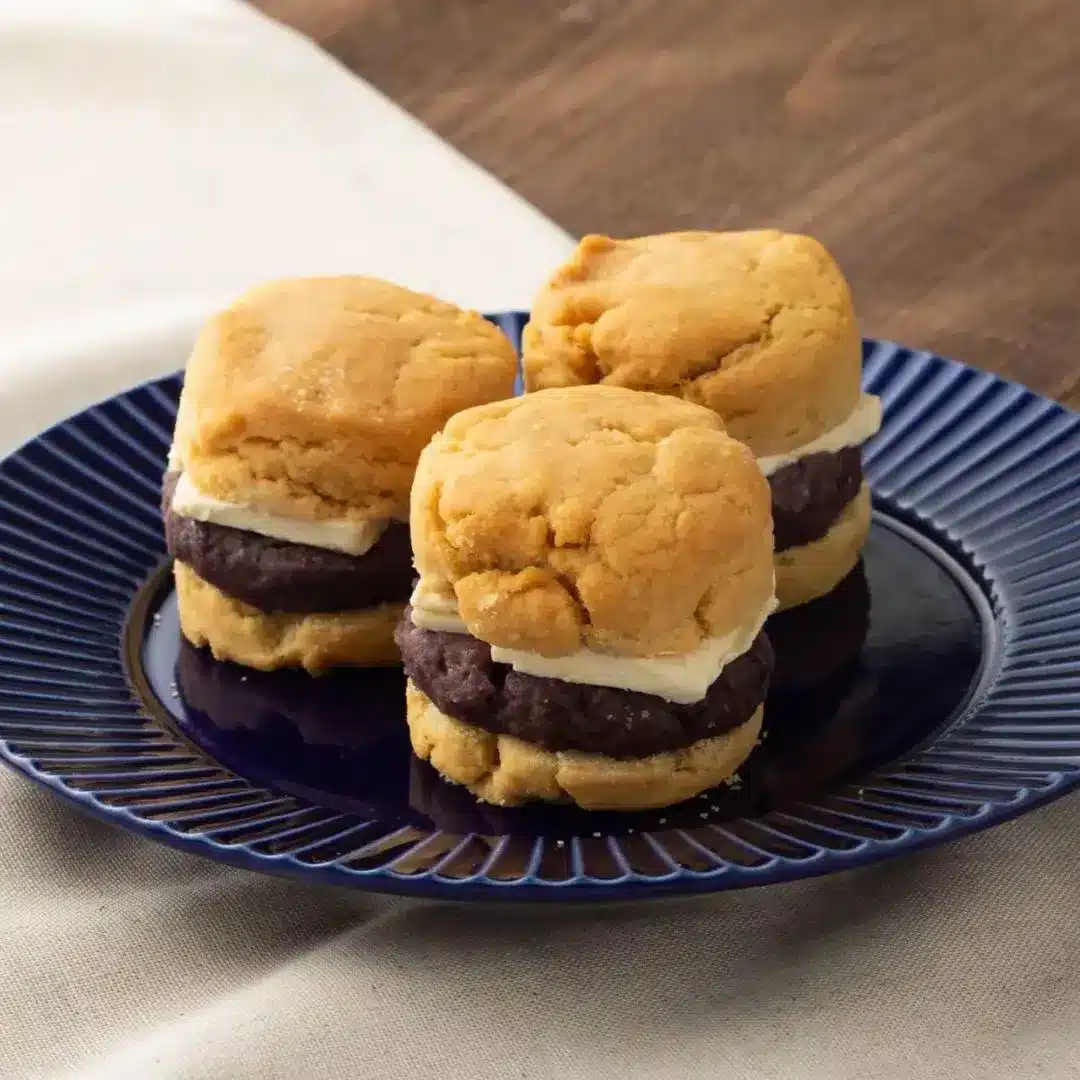 米粉(国内製造)、餡子(北海道産小豆、甜菜糖)、有機豆乳、菜種油、有機ヴィーガンバター(有機菜種油, 有機ココナッツオイル, 有機シアバター, 有機アーモンド, 食塩, 有機キャロットジュース, 有機レモンジュース / 乳化剤(ひまわりレシチン), 香料)、きび砂糖、アーモンド、大豆粉、食塩/膨張剤、香料(一部に大豆・アーモンドを含む)