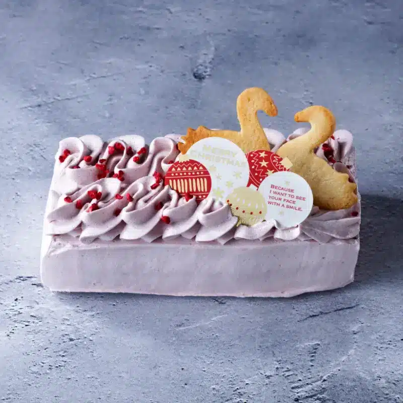 デコレーションはクリスマス限定の特別バージョン。ちょこんと並んだ2羽の可憐なスワンクッキーが、心くすぐる愛らしいデコレーションです。