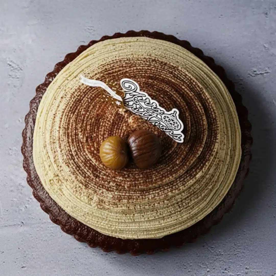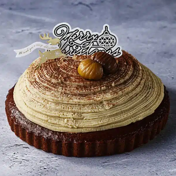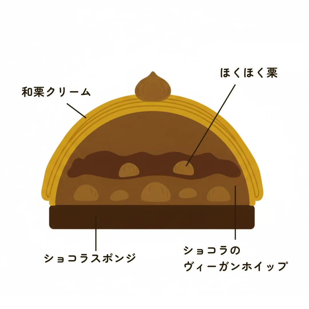 しっとりと焼き上げたショコラスポンジに、なめらかなショコラクリームと九州産和栗のマロンクリームを重ねました。チョコレートの深いコクと和栗のやさしい甘さが上品にとけ合う、贅沢な味わいのヴィーガンホールケーキです。