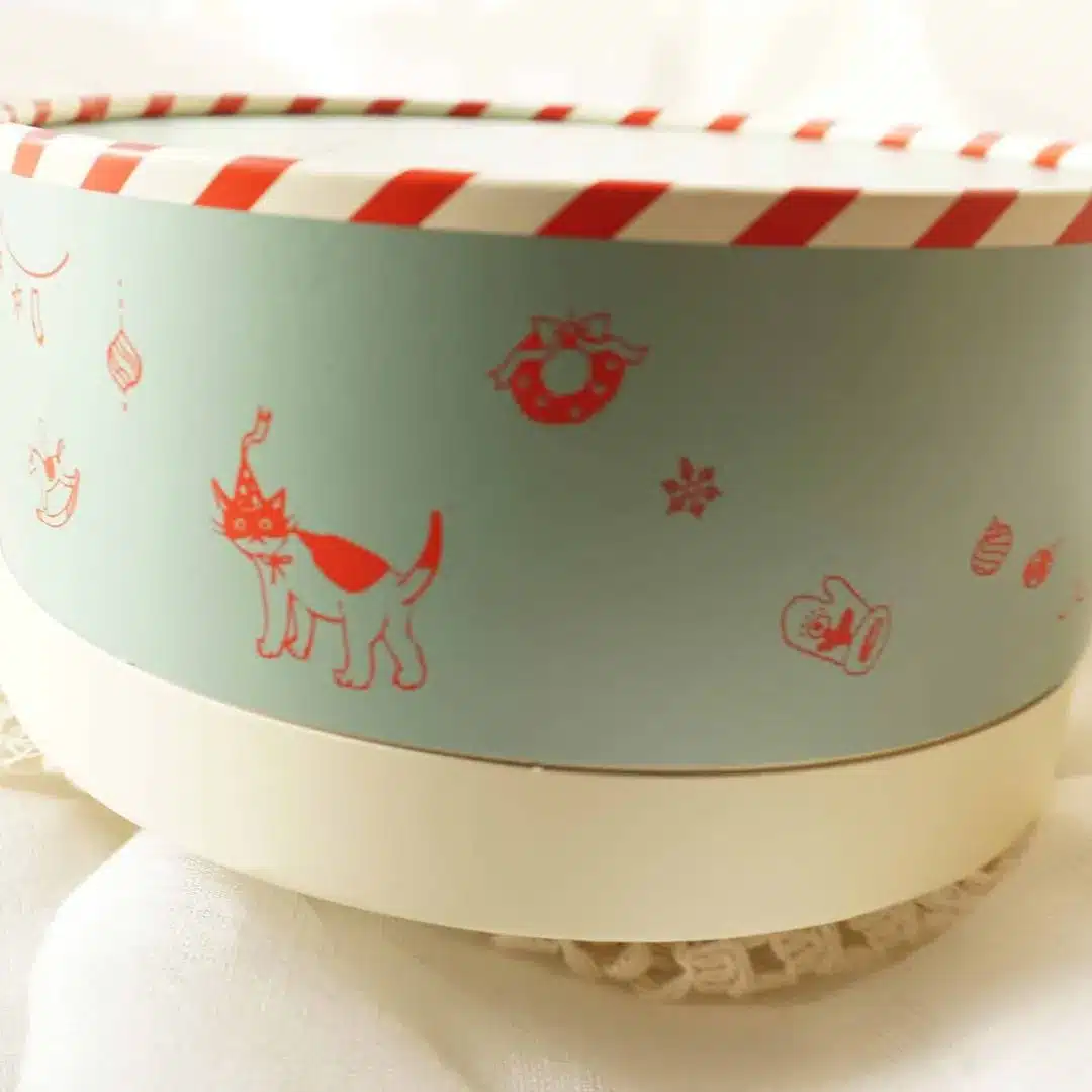 クリスマスカラーのストライプが目を引く丸いギフトボックス。よく見ると、側面の小さなのぞき窓から愛らしい赤い子猫がこちらをじっと見つめています。